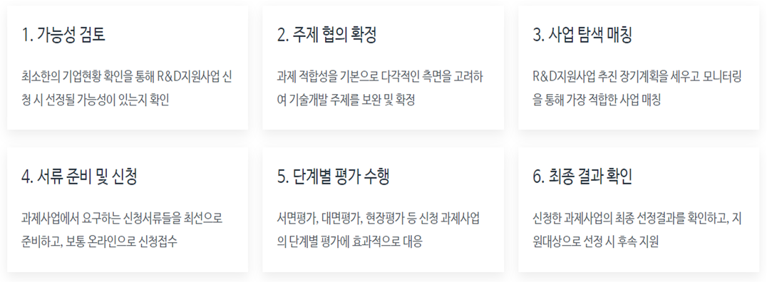 정부 각 부처의 R&D 사업을 최적의 매칭 시스템으로 적정 테마의 선정과 사업계획서 작성, 사전신청,PPT 자료 지원 및 수주를 위한 제반 활동을 최고의 전문가가 진행합니다.